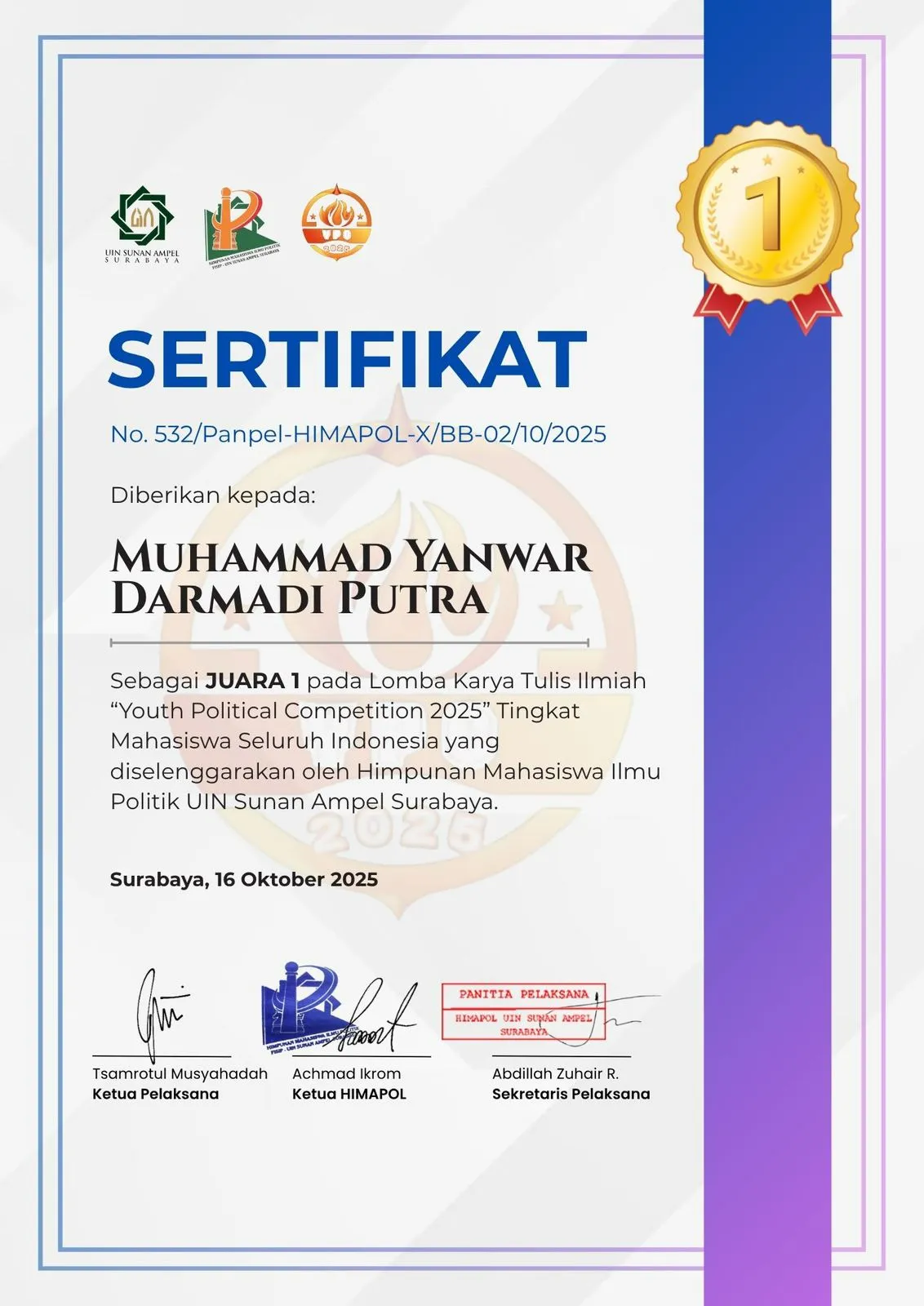 Mahasiswa berprestasi, Muhammad Yanwar Darmadi Putra, berhasil meraih penghargaan Juara 1 dalam Lomba Karya Tulis Ilmiah “Youth Political Competition 2025” tingkat mahasiswa se-Indonesia. Kompetisi yang diselenggarakan oleh Himpunan Mahasiswa Ilmu Politik (HIMAPOL) UIN Sunan Ampel Surabaya ini berlangsung pada 16 Oktober 2025.